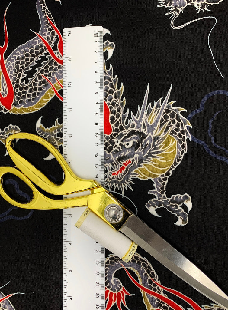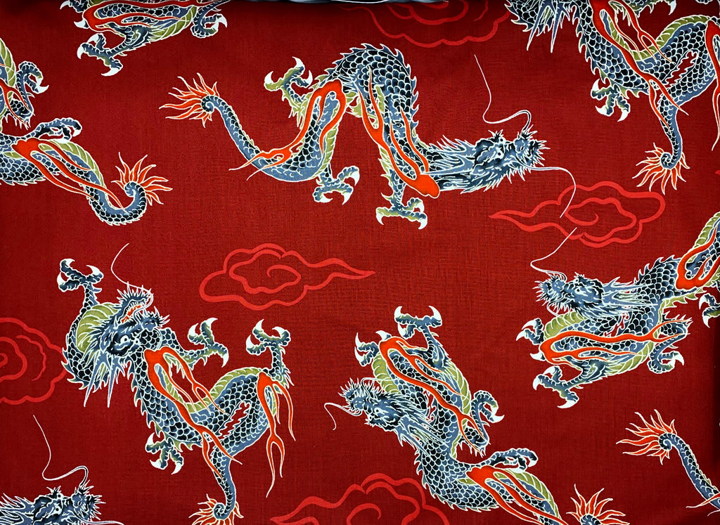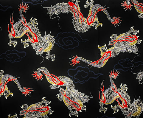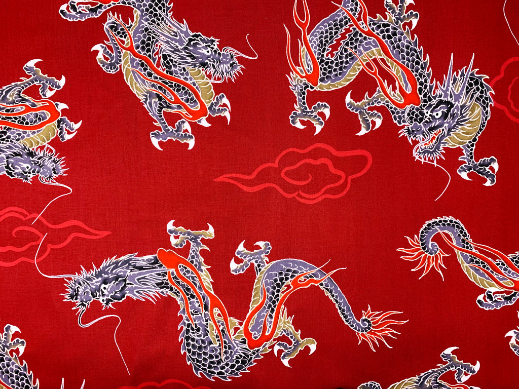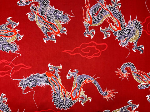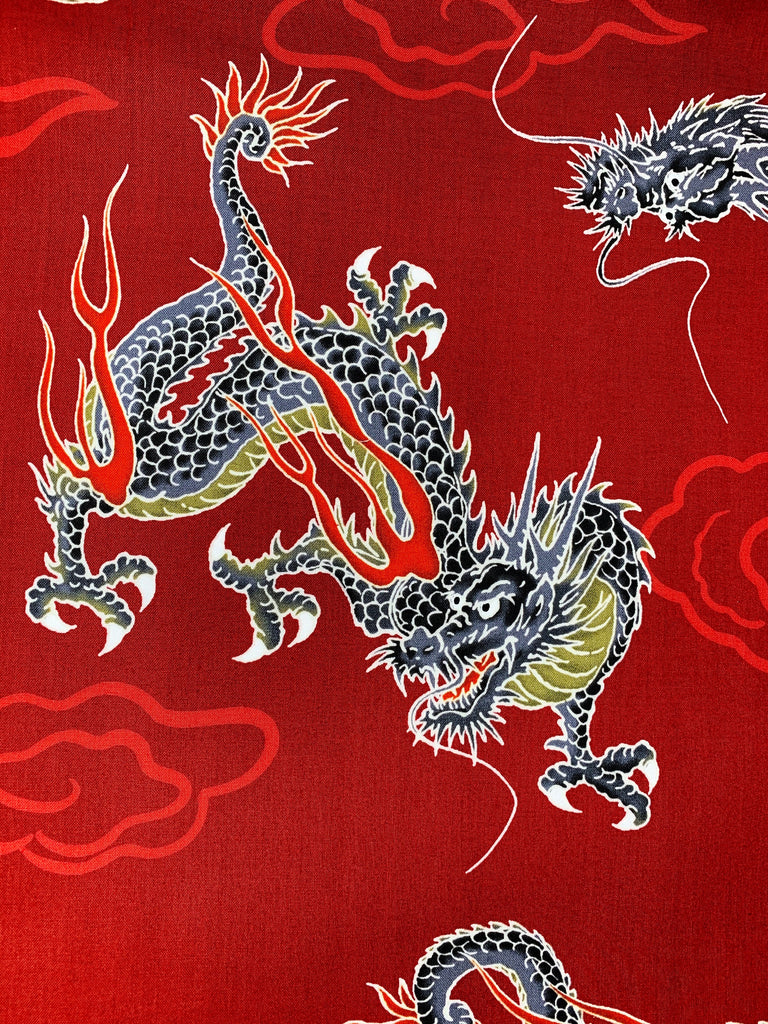 Japanese large dragons fabric. Japanese cotton fabric printed with large dragons on a blood red or black background.
