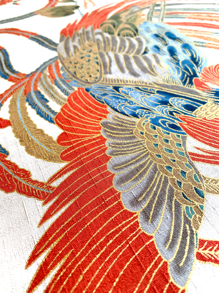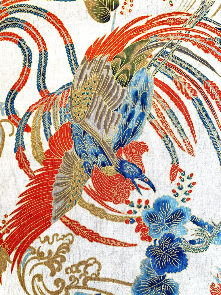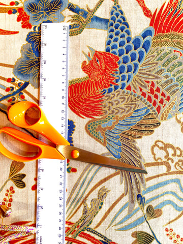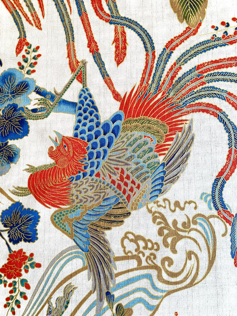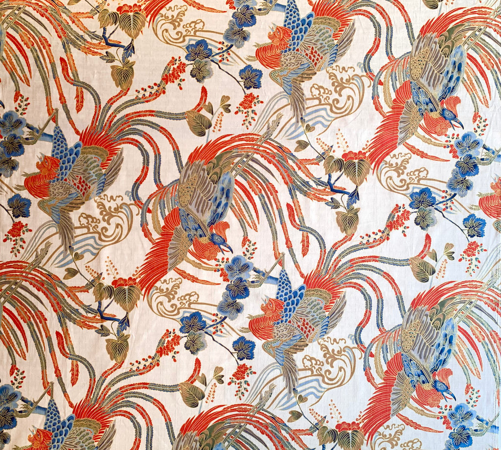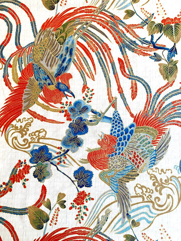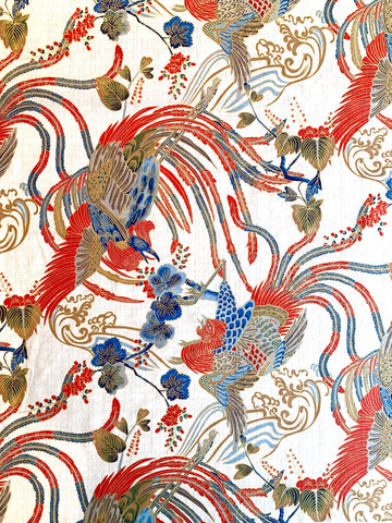 Japanese cotton fabric printed with a vibrant design in orange and blue on an ivory coloured background. Gold coloured metallic highlights catch the light.