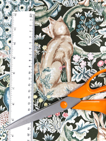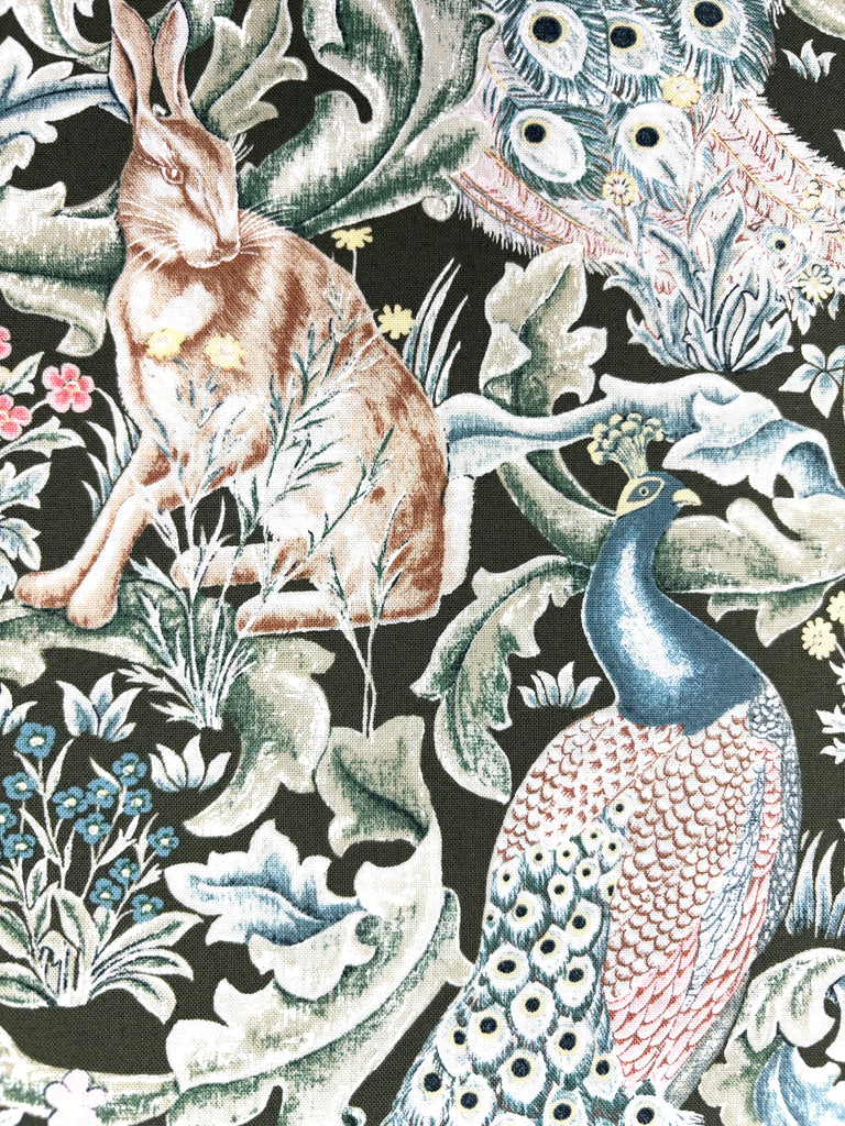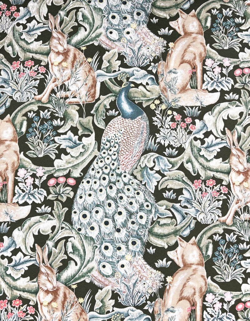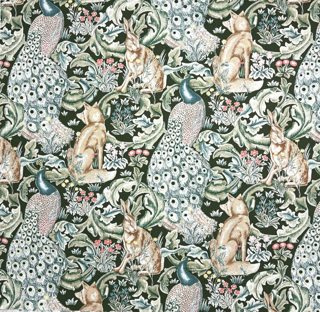 Morris & Co Forest fabric. Traditional Art Nouveau print in shades of green with pink highlights. Pattern repeat approx 30cm/12", peacocks are approx 28cm/11" long.