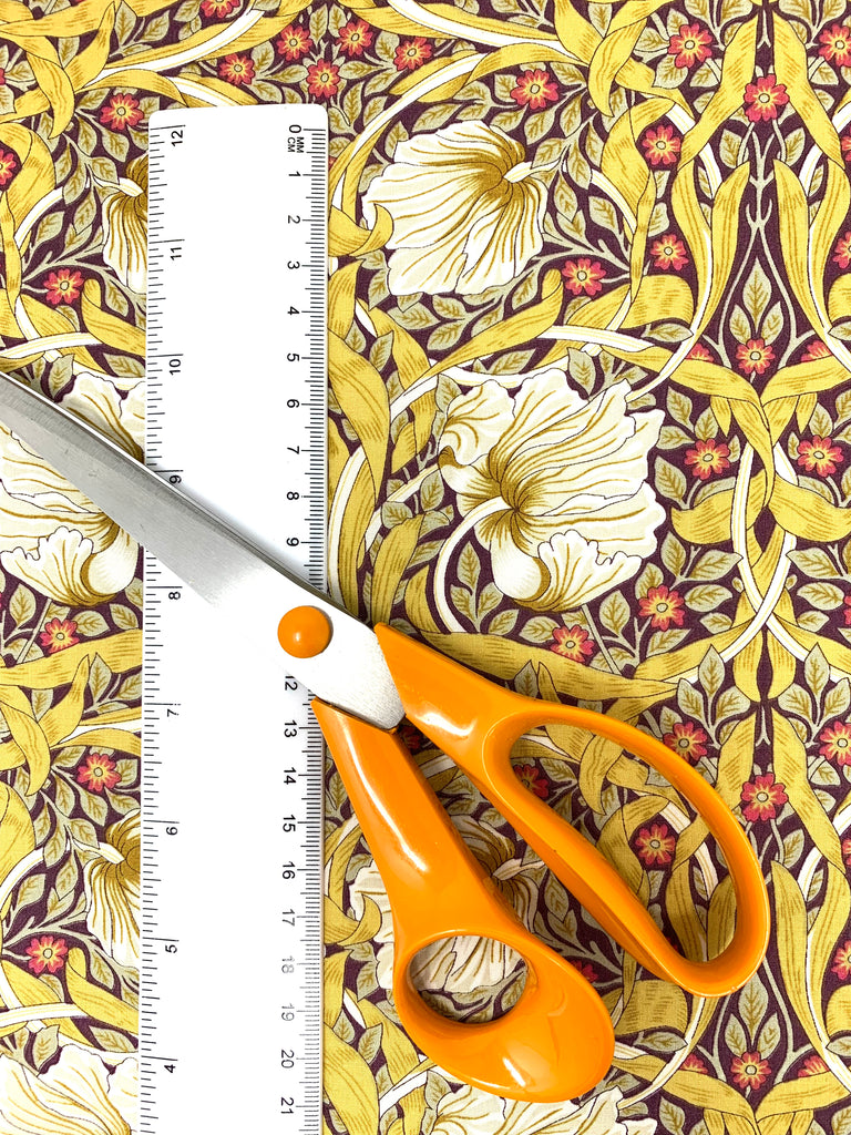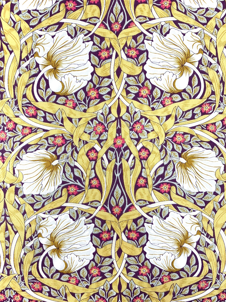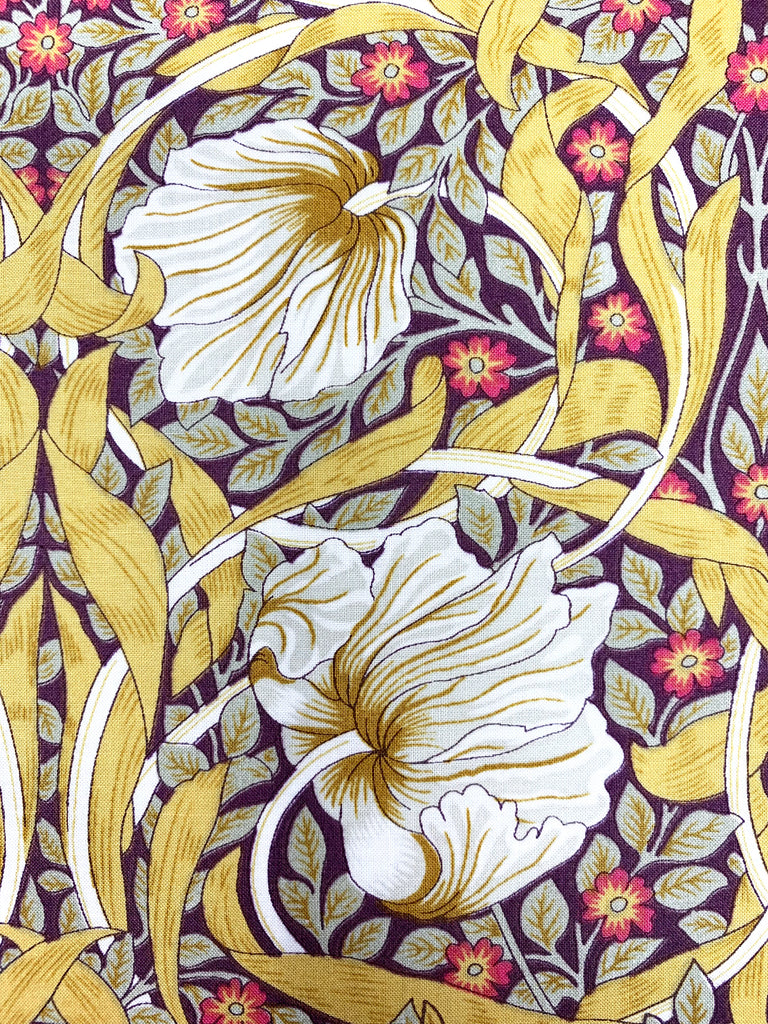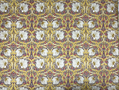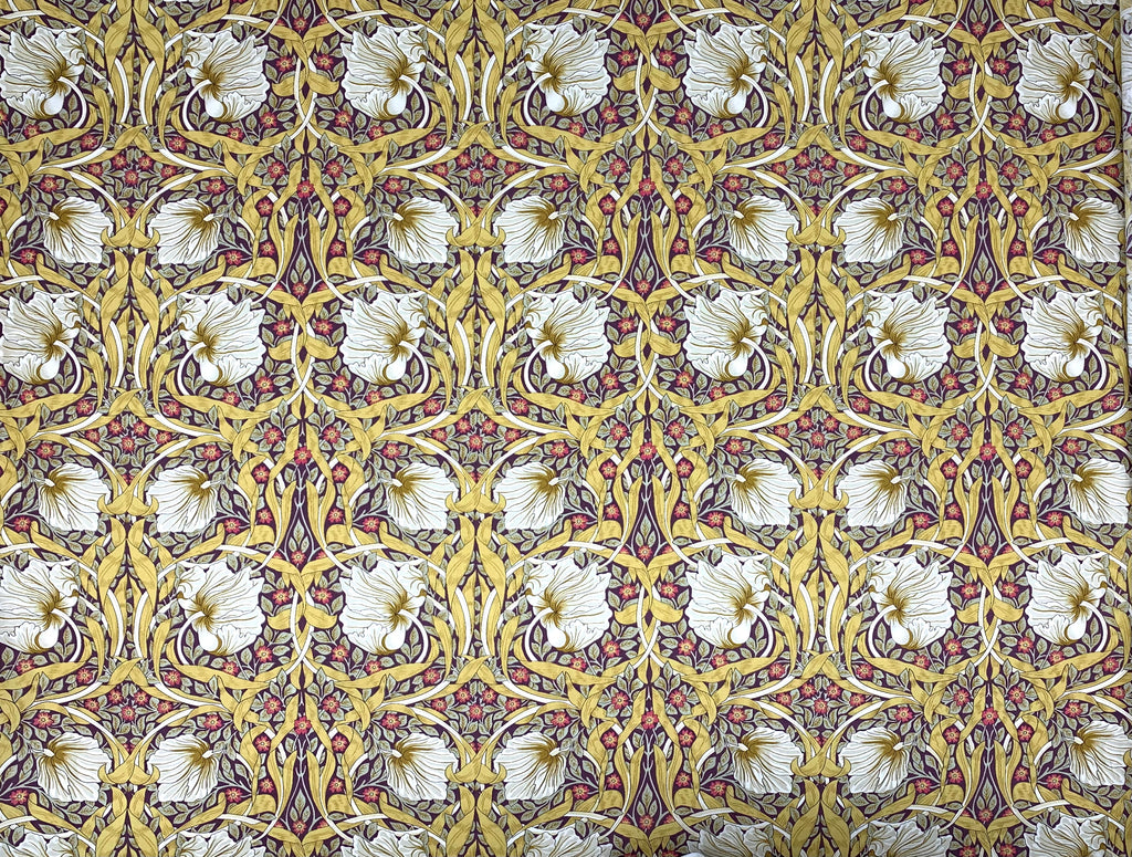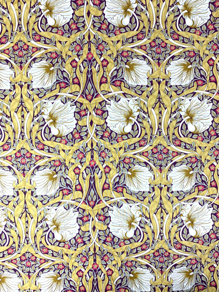 Traditional William Morris Art Nouveau print in a mustard/gold (not metallic) and aubergine colourway.