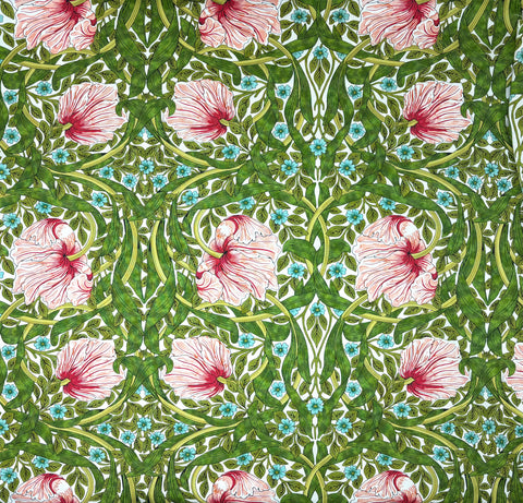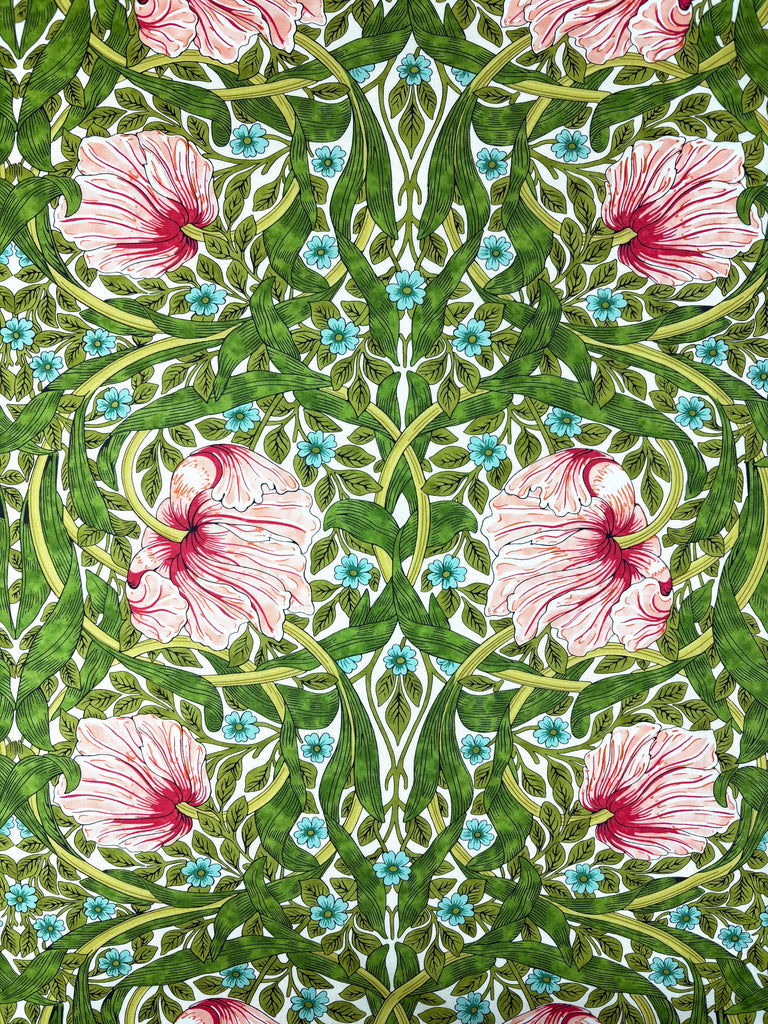 Traditional Art Nouveau print with large pink/peach flowers with bright green foliage.